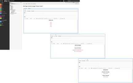 Changes to the standard display features of the footer are not made in the content area of the footer. Instead, the front end display of the default footer is derived from the basic settings that you choose for various functions of your website.