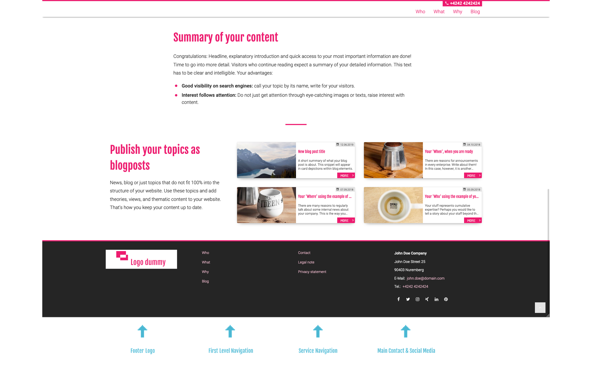 Important: All links (in our example to the navigation menu, e-mail address, and telephone number) must be adjusted and also updated manually to allow for later changes. Font sizes, styles, alignment, and design are up to you.