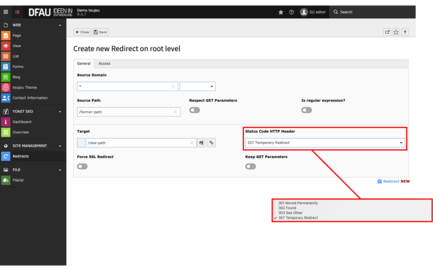 - Source Path: Here you enter the path from which visitors are to be redirected to a new target link. Make sure to begin the path with a slash (» / «).