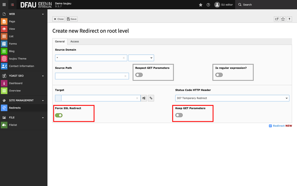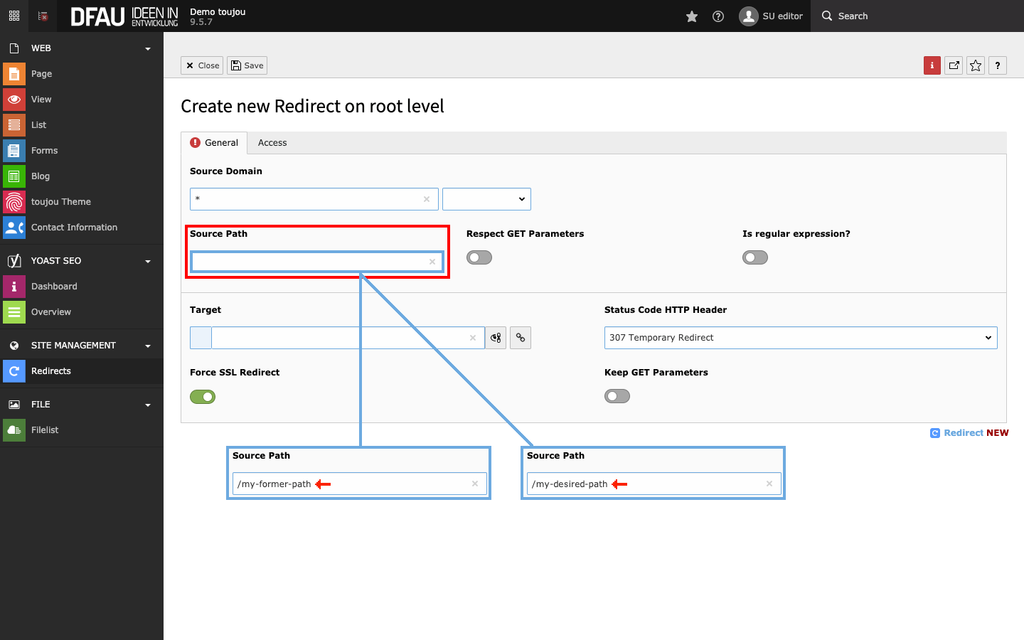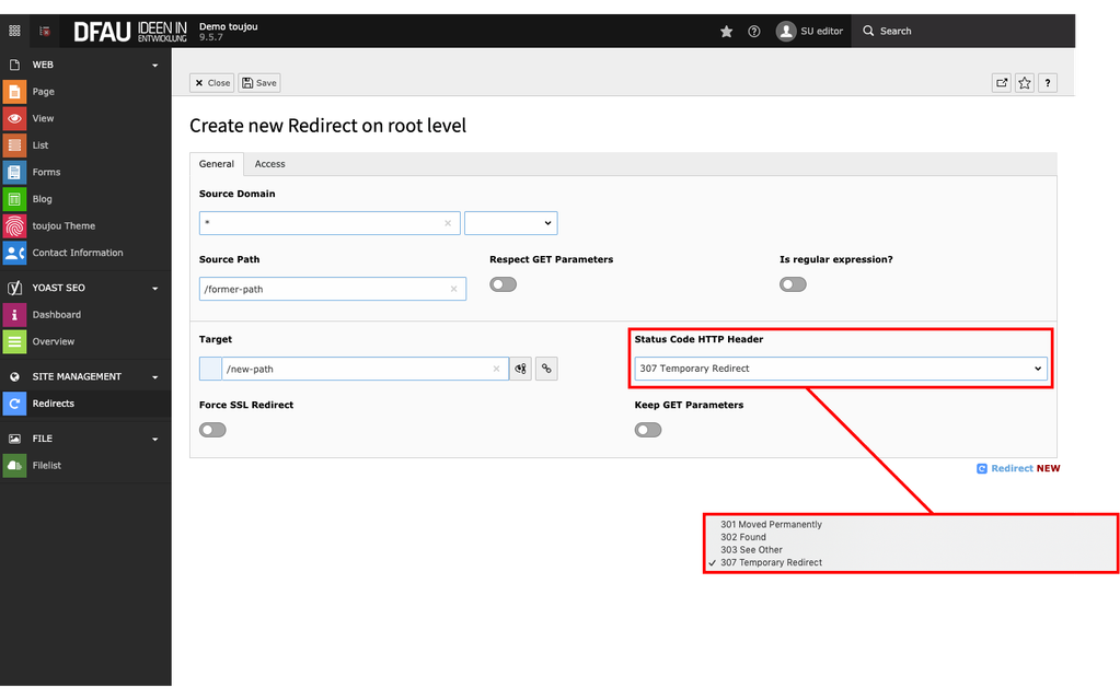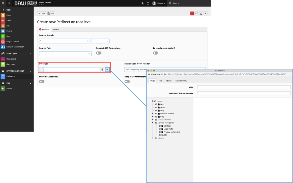 With the Redirects module, TYPO3 and toujou editors open up the possibilities in URL administration, which previously had been reserved for only webmasters and administrators before the introduction of TYPO3 version 9.