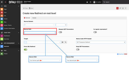 - A URL was renamed (e.g. after a relaunch or in the page properties). In the future, visitors who start from a former URL path need to be directed to the new path. To achieve this, enter the former URL segment manually or by copy and paste into the Source Path section.