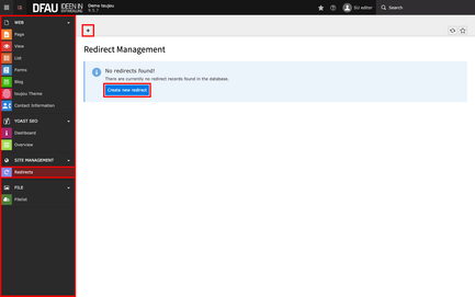 - Click on Create new redirect or on the +-sign above the workspace to create a new redirect.