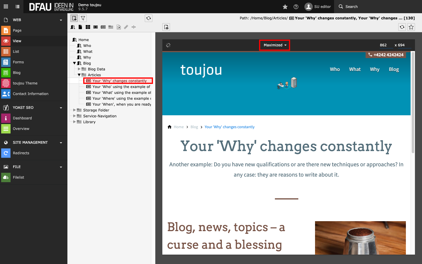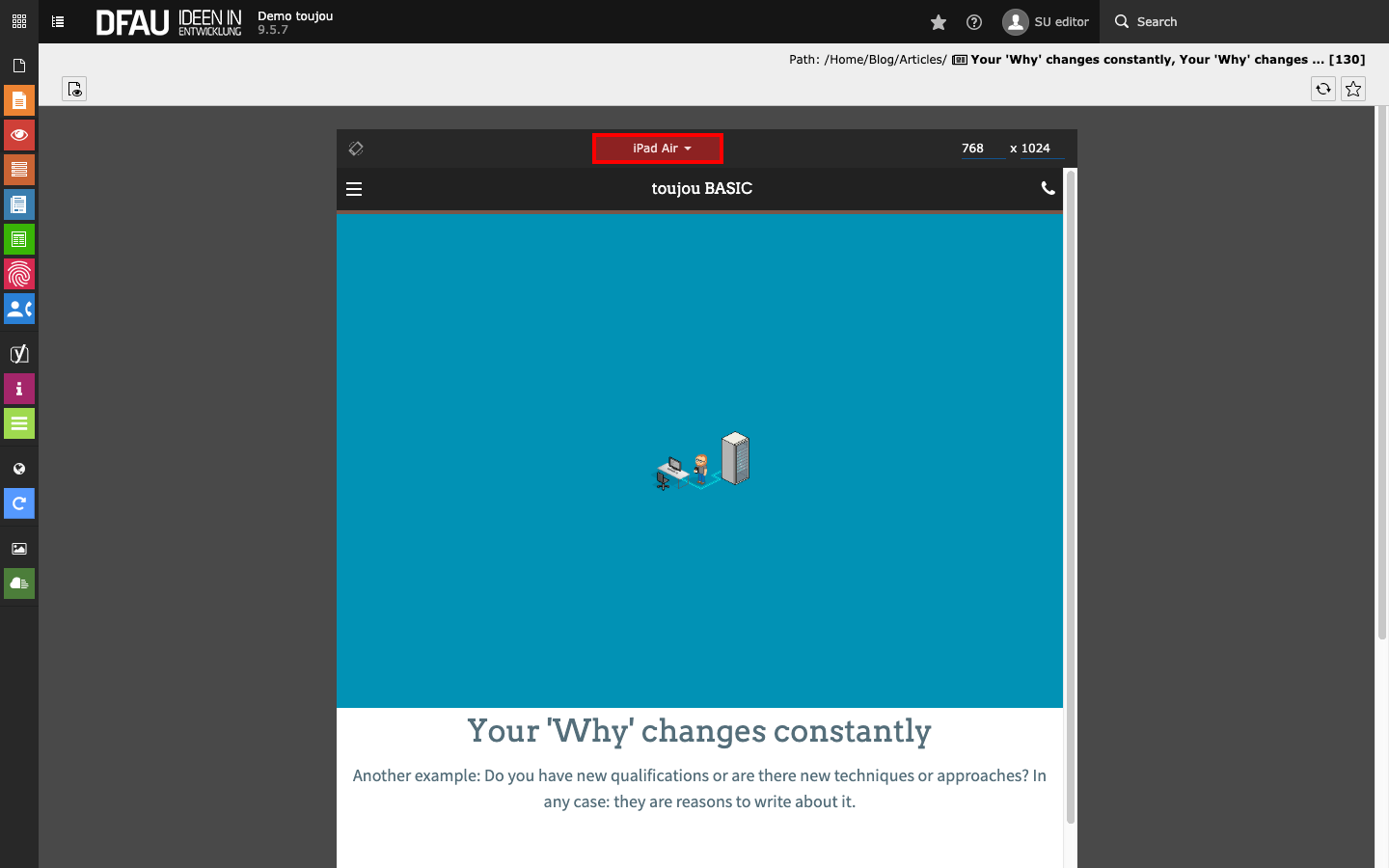With toujou, you can check your pages before publishing or editing just like you’re used to in TYPO3. In this section, we’ll explain how to use the view module along with how to test and optimize the performance of your website for all devices.