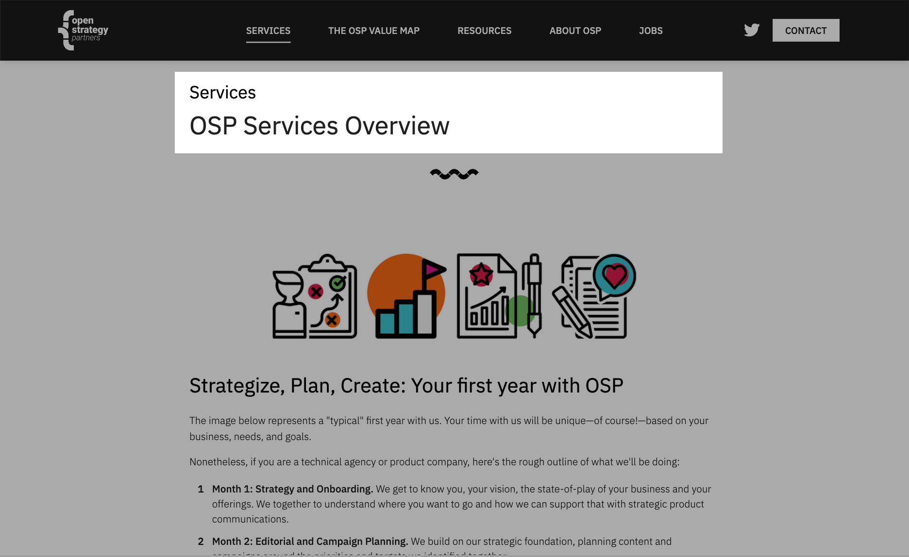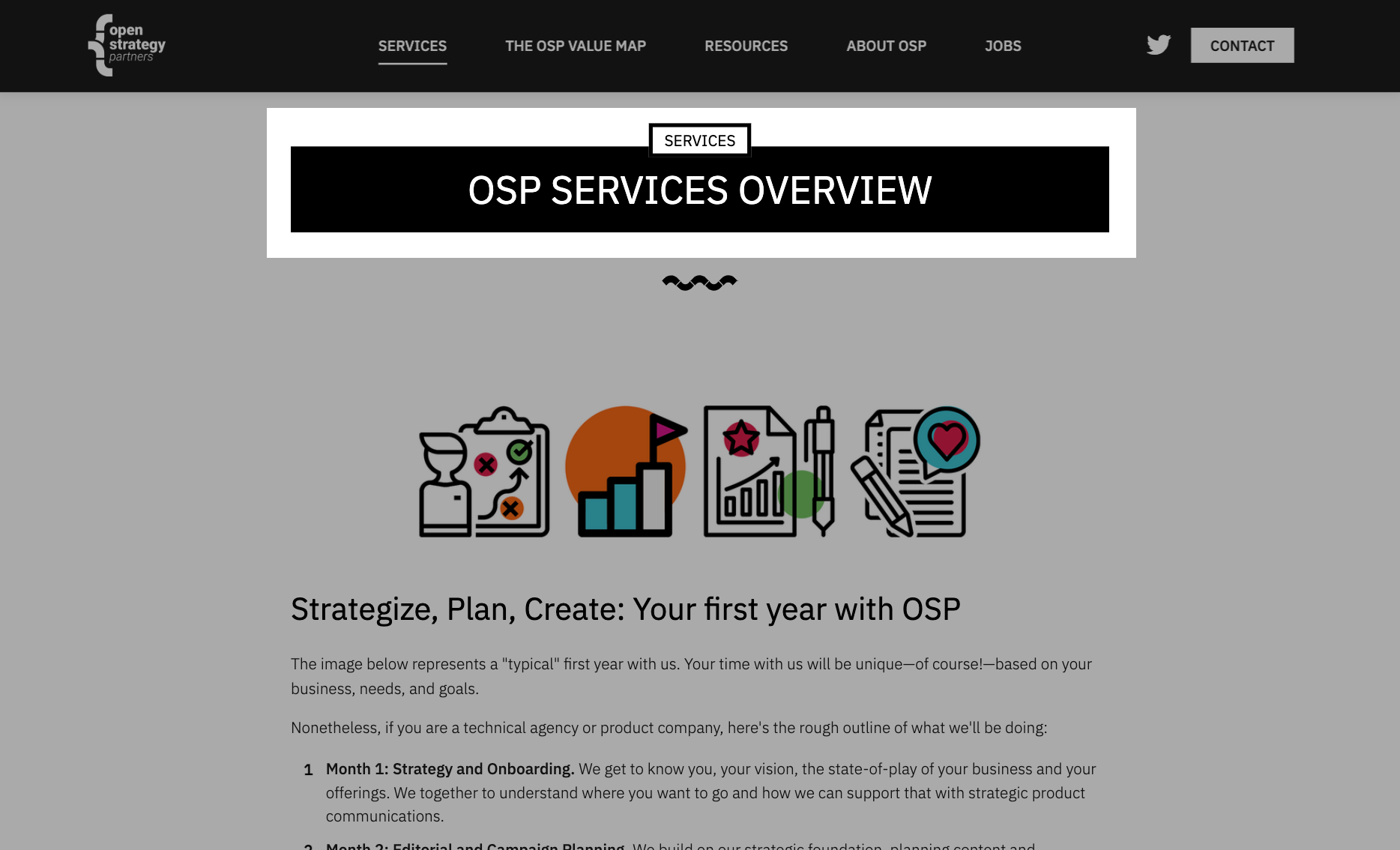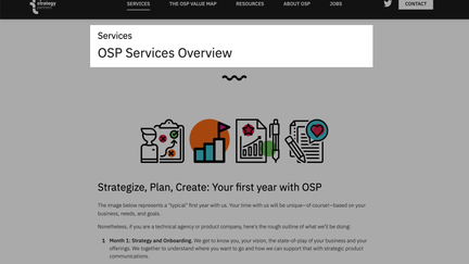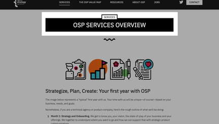 With design adjustments using CSS (Custom Style Sheet), OSP has depicted the headlines in differently colored boxes: "Services" in black font on a white background with a border, and "OSP Services Overview" in white font on black. Both headlines appear in uppercase and are centered, with the upper box overlapping into the lower one.