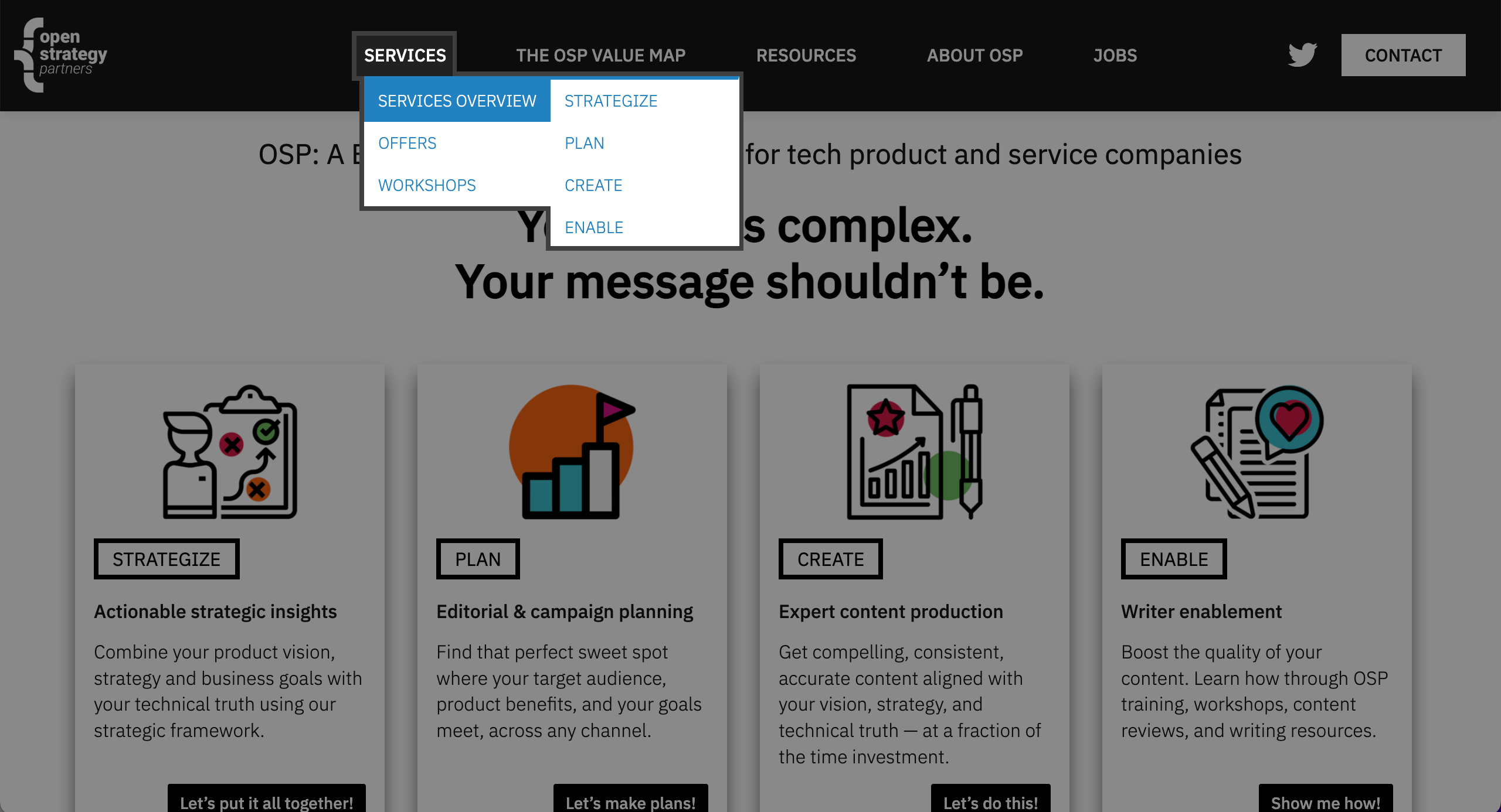 As previously mentioned, the Value Map employed by OSP was given a prominent position in the main navigation of the new website. The landing page explains how OSP collaborates with customers to develop a set of values that form the basis of all communication. When we talk about "values," we mean the worth that a feature, attribute, or product offers to the consumer of the digital service. "Every aspect of your product becomes structured data distilled into reusable logical-functional groups, product positioning, and all your communications," as stated on the website.