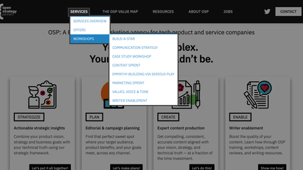 Openstrategypartners.com is also a special website because its creators don't hold back their knowledge. Their entire communication strategy and approach are documented and transparently offered. The Value Map, various author guides, and blog posts on a range of topics are fully accessible to visitors and thus immediately applicable for their own communication.